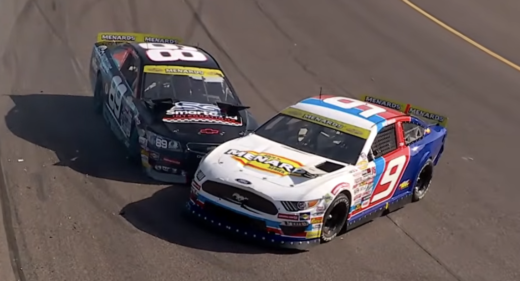 Earnhardt and Nate Moeller, driving Dale Earnhardt and Mark Martin throwback schemes respectively, stopped on track shortly after the accident (SCREENSHOT: FS1)