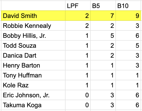 Smith’s first last-place finish came two races ago at Tri-City, a race that unfolded similarly to Saturday night’s event in Roseville. Both races featured a car count of 15, saw Smith’s No. 05 car anchor the field in qualifying, and had all 15 cars running at the finish with Smith bringing up the rear. Roseville’s race also ran caution-free - despite this, Smith was actually able to improve upon his Tri-City result by completing 136 laps Saturday night, two more than the 134 he ran in his previous LPF.