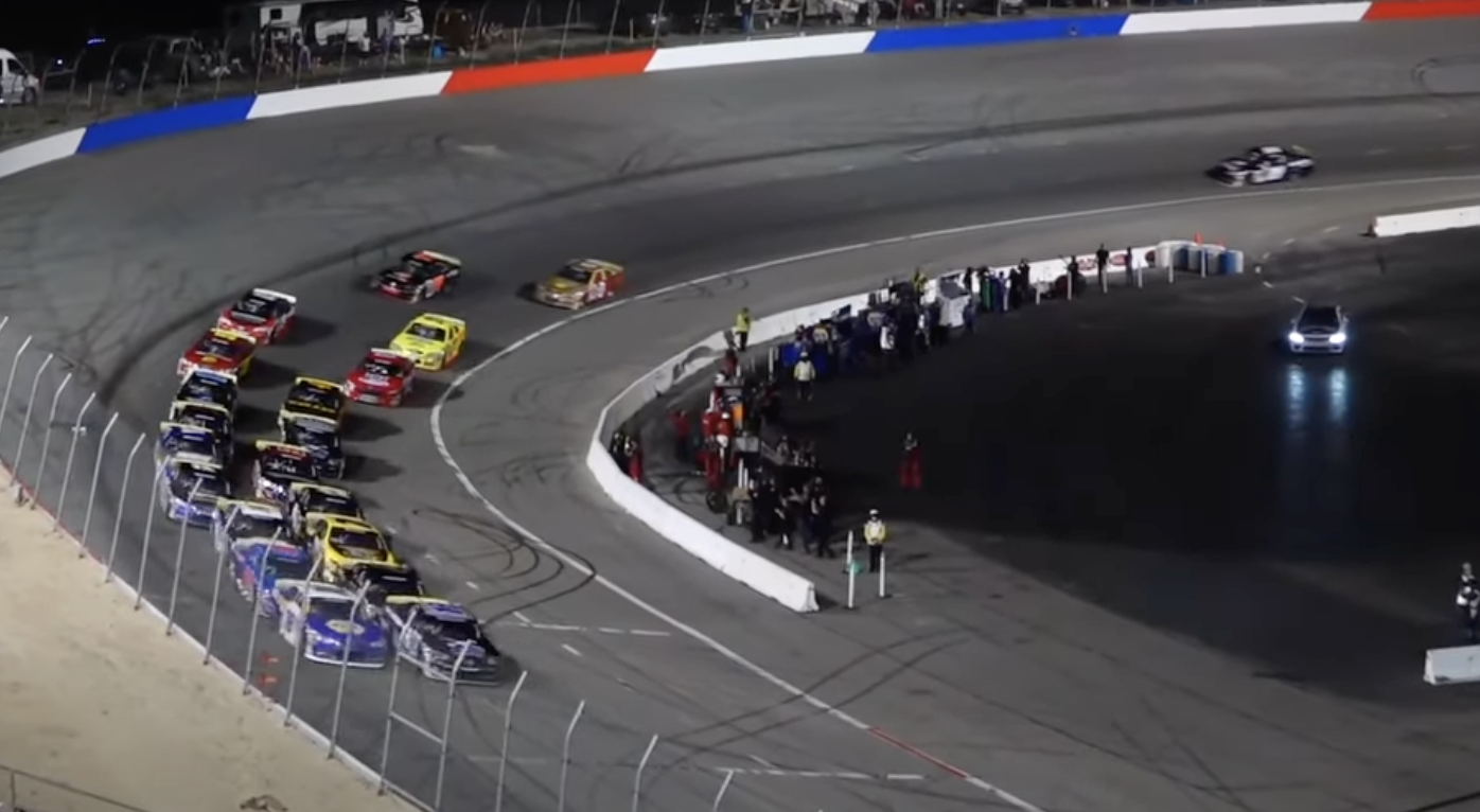 Barton’s No. 21 car trails the pack on the race start, while Huffman’s red and gold No. 0 appears as the second-to-last car on the grid coming to the green flag. (Screenshot: Flo Racing)