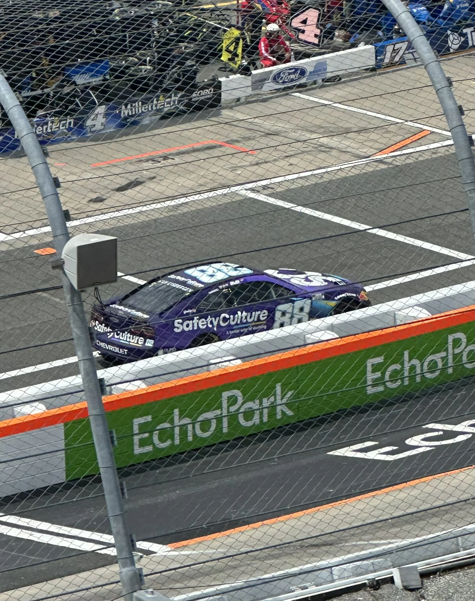 During TNT’s starting lineup animation, Yeley’s picture was incorrectly used a second time for Shane van Gisbergen, winner of the last two races. On Lap 3, Yeley was alerted that Van Gisbergen was falling back through the field from his 6th spot on the grid. Still, Yeley remained in last, 7.095 seconds back of the lead on Lap 4, then 8.844 on Lap 6, when he was told his car was fast on corner exit, but slow in the center. On Lap 9, Van Gisbergen dropped back to 28th, and on Lap 10 radioed “something’s broken in the front.” By Lap 11, Yeley had dropped Van Gisbergen to last, and the #88 Safety Culture Chevrolet pulled down pit road. NASCAR made sure to instruct the team not to take on fuel as a competition caution would come on Lap 35.