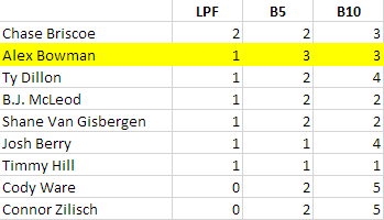 When the green flag dropped, Finchum remained in last place, 3.502 seconds back of the lead to Byron and Gilliland’s tie at 3.279. On Lap 2, Finchum looked to the outside of Gilliland, but couldn’t get by, the tried it again on Lap 3, where he started to gain an advantage entering Turns 1 and 3. By Lap 4, Finchum had pulled ahead into Turn 1, but Gilliland fought back for the next lap, during which Gilliland stayed just ahead of Finchum at the line. On Lap 5, Gilliland beat Finchum to the line by just 14-thousandths of a second - a 6.406 to a 6.420. By Lap 6, Finchum was back in line, watching as Cody Ware found himself in the middle of a three-wide battle with Byron to his outside and Gilliland down low. Byron cleared Ware first, followed by Gilliland, causing Ware to drop in front of Finchum.