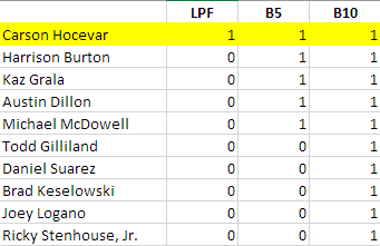 *This is the third different car number with which Hocevar has finished last in Cup, following Spire’s #7 at Gateway and Legacy Motor Club’s #42 in Las Vegas.