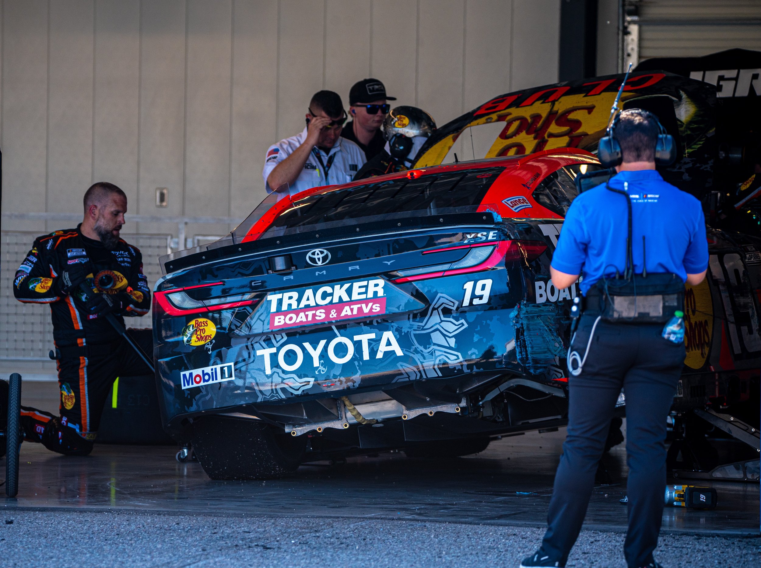Meanwhile, Briscoe had climbed from 20th on the grid to 3rd, and appeared to be logging laps until the end of Stage 2. But entering Turn 3, his car showed smoke from the left-front, then skated up the track and pounded the outside wall with the right side, causing the nose of the car to briefly lift off the ground. Briscoe was uninjured as he steered the car behind the wall. He was soon checked and released from the infield care center, and NASCAR declared his #19 the first car out of the race. For the second-straight week, Briscoe was running solidly in the Top 5, only to finish in last place.
