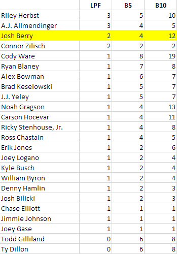 Berry now faces a “must win” next week in Bristol - a track where the Wood Brothers have won only once, with Elliott Sadler in 2001. He ranks 16th and last in the Playoff standings, 45 points below the cutoff line.