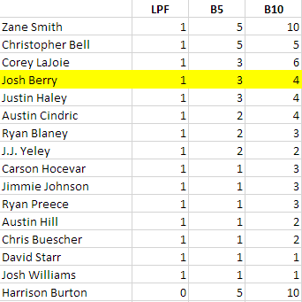 *This was Berry’s first last-place finish in any of NASCAR’s top three series – 133 in total between 27 in Cup, 95 in XFINITY, and 11 in Trucks.