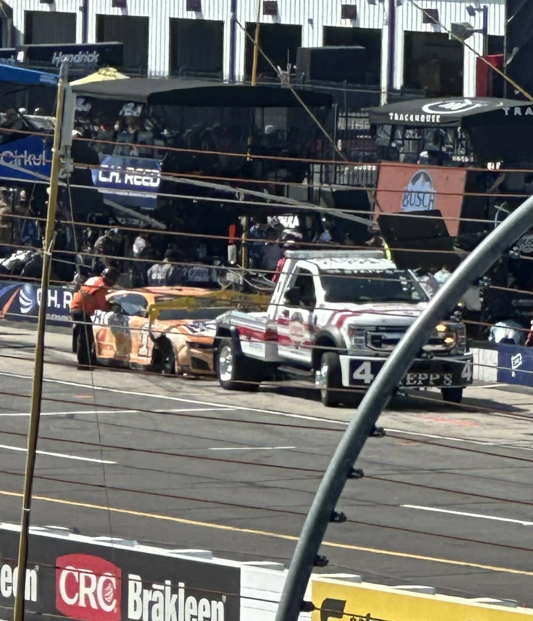 Chastain’s damaged car being towed off pit road (PHOTO: Matt Miller, @MGMiller17)