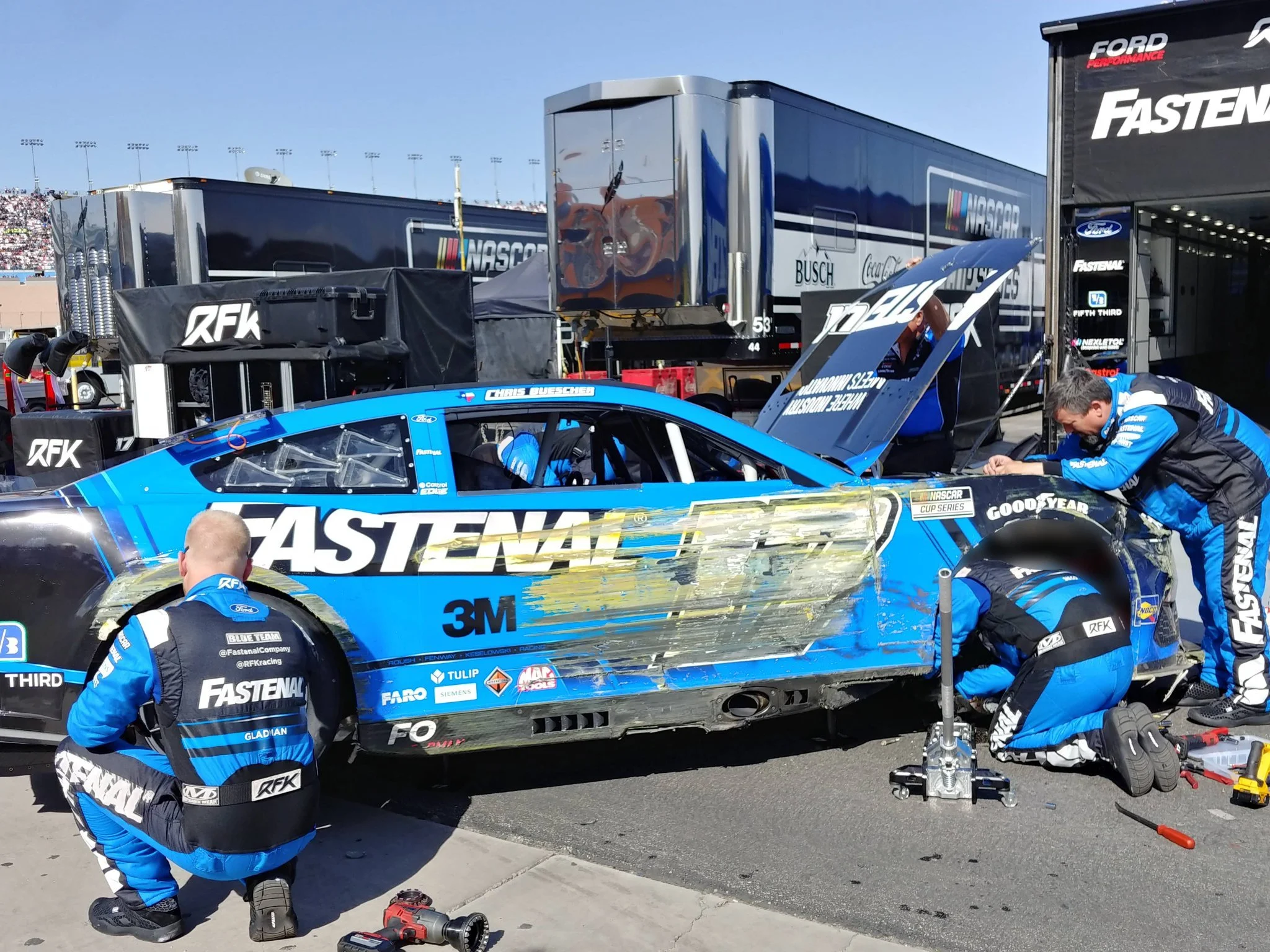 On Lap 28, Buescher was running in 7th, having taken right-side tires only under the Bell caution. But entering Turn 1, the loose lug nut came off his right-front wheel, followed by the rim, the inner flange carved off by the caliper. Buescher struck the wall hard enough to force a red flag for a welding crew to apply a patch to the spot, but was able to make it back to pit road. The crew noted “right-front’s killed, upper control arm,” and NASCAR called for a tow truck to bring the #17 behind the wall. On Lap 30, the tow truck arrived, then completed a 270-degree turn into the opening close directly behind theirs at Stall 14. Buescher took last from Smith on Lap 33, the first car out of the race.