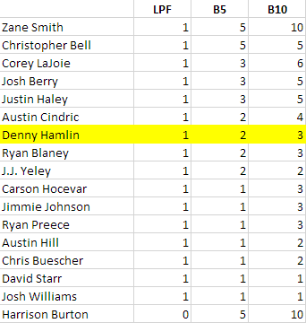 *Hamlin is also the first driver since Hubert to finish last in back-to-back Cup Series races at Sonoma. Hubert’s streak was actually three in a row, all while driving for Kirk Shelmerdine Racing.