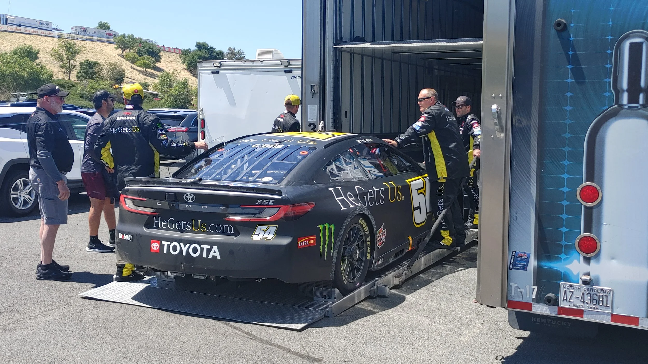 It was a similar story for teammate Ty Gibbs, who on Lap 16 felt his #54 He Gets Us Toyota glance off the brand-new jersey barriers at the exit of Turn 11. The impact, which tore away one of the Save Mart banners, caused significant damage to the right-front suspension that made him slow in Turn 1. Gibbs made it back to pit road, only to drop out of the race under the “Damaged Vehicle Policy.” On Lap 26, the crew was still repairing the right-front suspension, and by Lap 48 were able to push the car to the end of the garage, complete a series of turns, and load it onto JGR’s unmarked white trailer at the far side of the paddock.