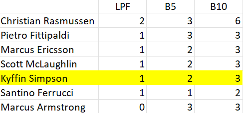 Qualifying was much of the same story, with wet conditions playing a starring role in setting the starting lineup. Castroneves was the slowest of all cars, with his lap in the 2:09 range substantially off anyone in the field. Simpson finished sixth in Group 1 and made his first-ever Fast 12 appearance. It was not really a close call, either, as he was almost half a second to the good over Christian Lundgaard. He was last in the Fast 12, but was only a tenth and change behind O’Ward for 11th. For the second straight year, Road America qualifying was arguably the highlight of his single-seater career.