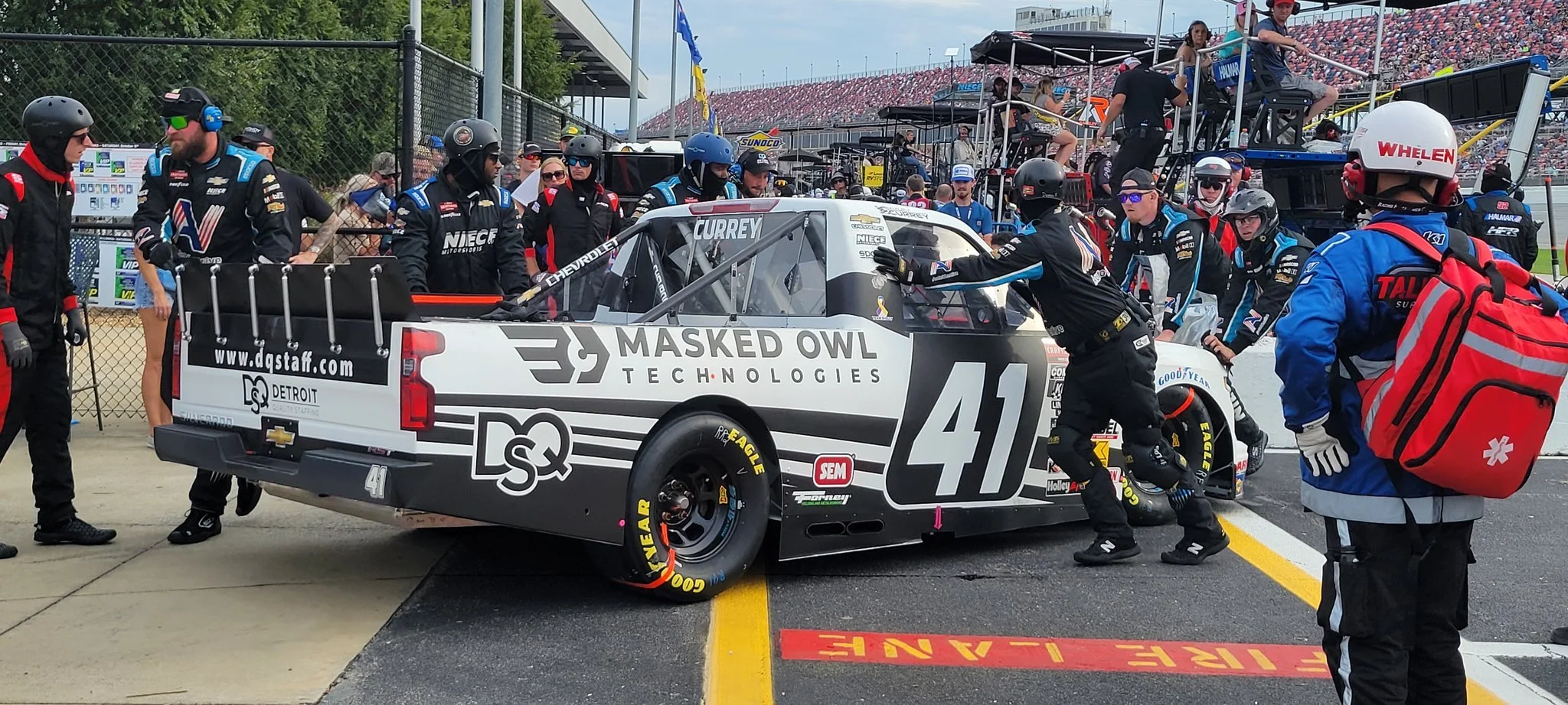 Bayley Currey picked up the 3rd last-place finish of his NASCAR Craftsman Truck Series career in Friday’s Love’s RV Stop 225 at the Talladega Superspeedway when his #41 DQS / Masked Owl Technologies Chevrolet fell out with rear gear failure after he completed 17 of 85 laps.