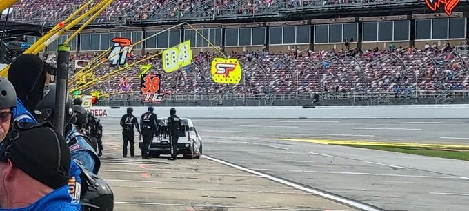 Soon to join Currey in the garage was the #1 Starkey / Soundgear Toyota of polesitter William Sawalich, who made his superspeedway debut one day after his 18th birthday. Sawalich had also tumbled down the rankings during a lengthy stop of his own. On Lap 30, as he was pushed behind the wall, Sawalich was told he’d return to the track “and learn the rest of the day – that’s what it’s going to be about.” By then, he was seven laps down in 35th, five laps ahead of Currey. But on Lap 39, Currey’s team appeared to declare themselves out of the race. “Hate that,” said someone on the #41 team’s radio, “Sorry, everyone.” He was declared out of the race soon after.