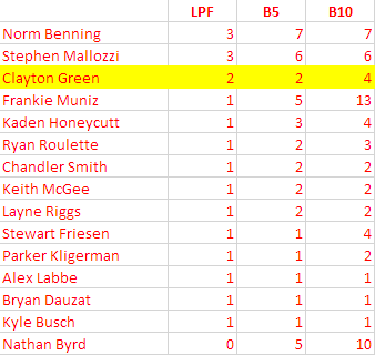 Byrd returned to the track on Lap 48, saying, “Thanks for getting me fixed up, guys,” then joking about if 40 cautions could put him on the lead lap. Four laps later, Costner also came back out, his truck just one lap ahead of Byrd. Both passed Mills who fell to 29th, setting up a battle for the 27th spot. But Costner still had a tire rub, and was forced back to pit road on Lap 58, letting Byrd pass him for 27th. By now, the Harmon team felt they had nothing more to gain and pulled into the garage on Lap 62, done for the day. “I think you’re done if you go back (to the garage) twice,” said the team. The crew cleared out their pit stall, and Costner was declared out on Lap 74. Byrd remained 15 laps behind the next truck of Maggio, climbing out of the Bottom Five after Costner’s exit, but reaching no higher than 27th.