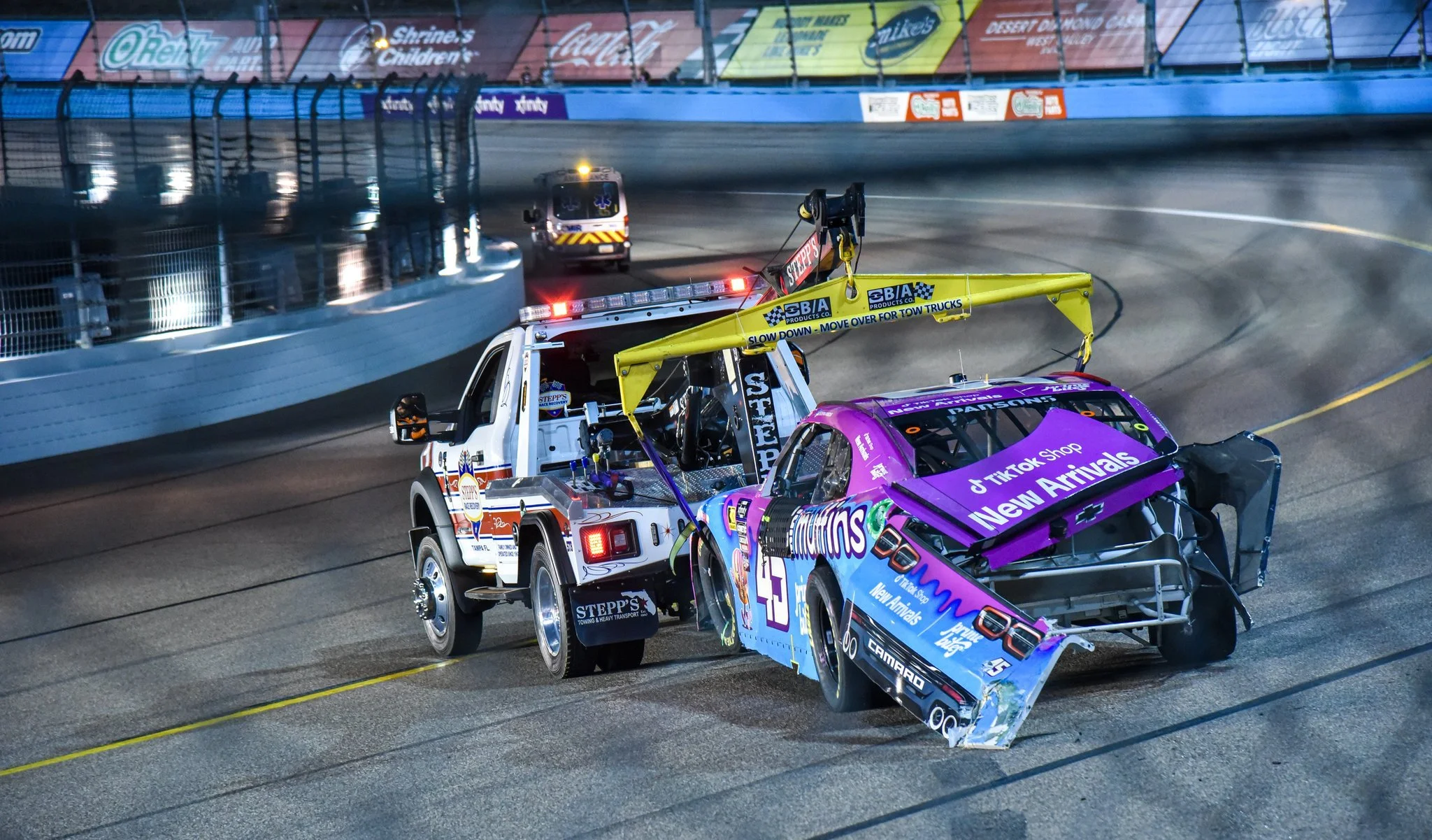 Smithley came in for adjustments under the caution, and after a momentary delay at the end of his stop, returned to the track. For the Lap 55 restart, he remained in 38th, one lap down, but now behind the RSS Racing teammates of Ryan Sieg in the #28 Sci Aps Ford and Blaine Perkins in the #29 Ashurst American Honey Ford. The duo dropped Van Alst back to 37th by Lap 59, but three laps later, trouble broke out in front of them. At the time, Stefan Parsons was in a side-by-side battle for 20th, racing to the inside of Anthony Alfredo’s #5 Dead On Tools Chevrolet. Just past the stripe, Parsons squeezed Alfredo into the outside wall. Alfredo followed Parsons, expecting him to cut off the corner as he gave him a bump in response. But when Parsons didn’t come up, Alfredo clipped Parsons’ right-rear instead, sending Parsons hard into the outside wall. As the field scattered behind, Van Alst was spun by another car and slammed the inside wall. As Smithley passed Van Alst under caution, the #14 briefly held last place until he turned the car around and made it down pit road. Parsons attempted to do the same, but the rear clip of his Chevrolet was destroyed, and he stopped on the approach to Turn 1. Parsons climbed out, his night done. The tow truck brought his car to the team’s hauler, where the crew wanted to see if it could still roll when they bolted on shop wheels and loaded up for the night.