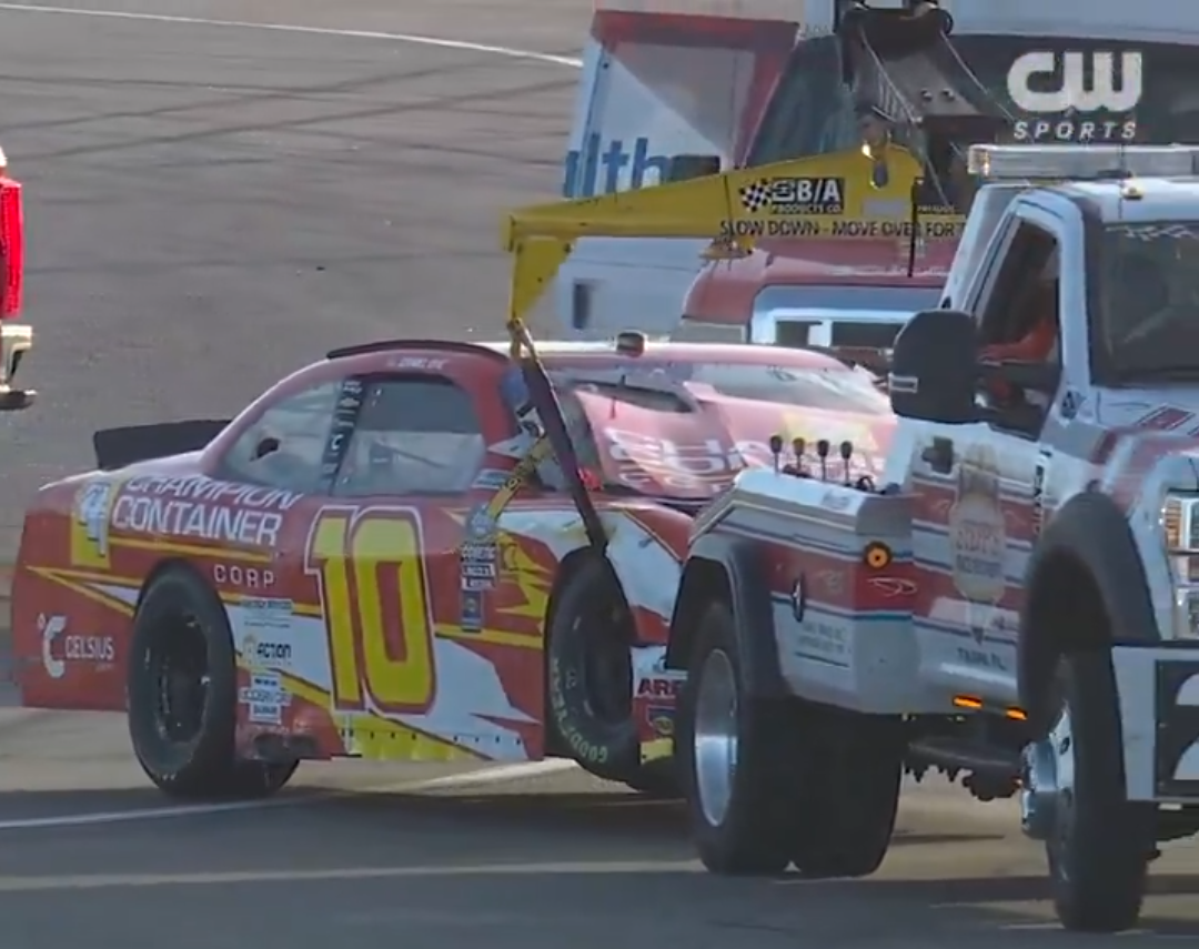 Running 4th in line on the inside, Brandon Jones’ #20 Swiffer / Menards Toyota was bumped loose by Jesse Love’s #2 Whelen Chevrolet, hooking Jones hard to the right, clipping the left-rear of Carson Kvapil’s #1 Bass Pro Shops / Clarience Tech Chevrolet. As Kvapil spun down the track, Jones immediately blocked the path of Dye, who smashed into the back of the #20. Dye’s car pinballed off the wall and into Jones a second time as the two careened onto the paved runoff area midway down the track. Jones managed to limp down pit road with the other drivers involved, including Connor Zilisch, who suffered nose damage to his #88 WeatherTech Chevrolet and briefly took the last spot on Lap 7. But Dye was stranded on the apron, and he immediately took the last spot from Zilisch that time by. Jones then joined Dye in the garage, taking 37th with the same five laps completed.